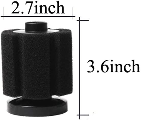 The small AQQA sponge filter is 6" in width and 11" in height, with a sponge dimension of 1.97" in width and 4.33" in height and a sponge inside circle diameter of 0.51 inches. The small AQQA sponge filter is suggested for 10 to 40-gallon fish tanks.