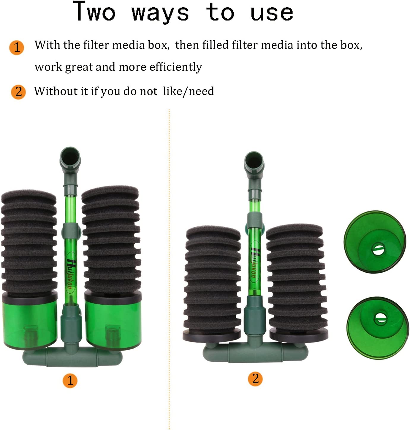Huijukon's double sponge filter is essential to any aquarium filtration system. Huijukon's retail package bag includes 1 x Huijukon double Sponge Filter with two media chambers (filter media not included) and 1 x Huijukon retail package bag.